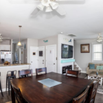 Prepare to be captivated by our gourmet kitchen, designed for both the culinary enthusiast and the social butterfly. This fully equipped kitchen features state-of-the-art appliances including a gas stove, a large refrigerator with a water and ice dispenser, and a microwave. The expansive white marble island is not only a striking centerpiece but also includes seating for three, perfect for morning coffee or casual dining. Adjacent to the kitchen, the formal dining area with a rustic brick backdrop comfortably seats six, making it ideal for memorable dinners with family or friends.